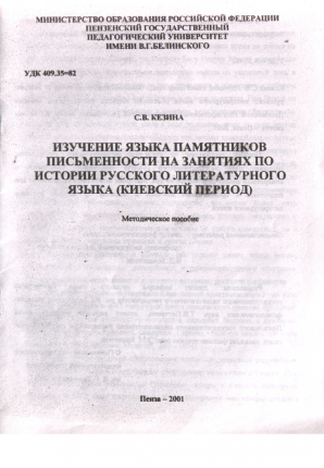 Кезина С. В. Изучение языка памятников письменности на занятиях по истории русского литературного языка (Киевский период): Методическое пособие (Пензенский государственный педагогический университет имени В. Г. Белинского). - Пенза, 2001.