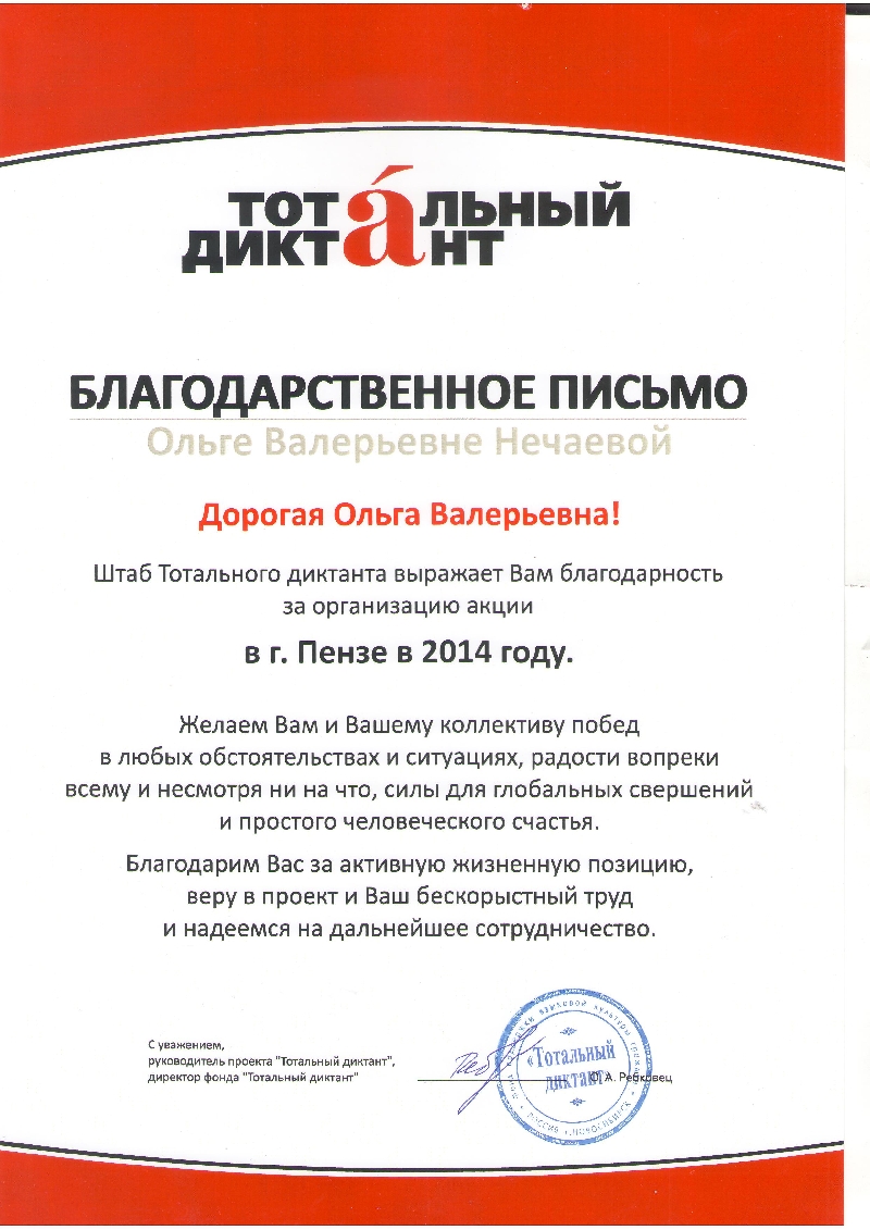 Повышение квалификации: ГАОУ ДПО "Институт регионального развития Пензенской области", программа "Подготовка членов предметных комиссий по проверке выполнения заданий с развёрнутым ответом экзаменационных работ ЕГЭ по русскому языку" (апрель 2014 г.).