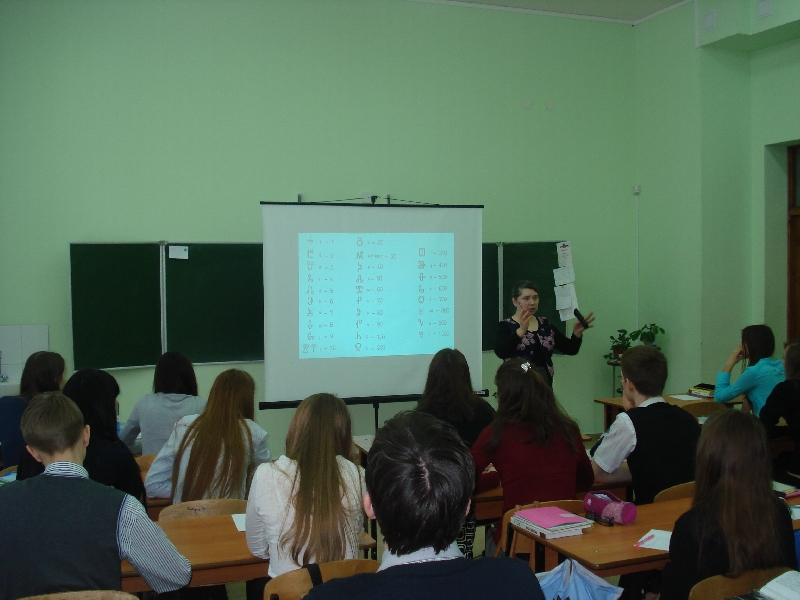 Во время педагогической практики в гимназии № 4 «Ступени» для учеников 10-х классов было проведено профориентационное мероприятие «1150 лет славянской письменности». Студентами Вадюниной Натальей, Терёхиной Викторией, Тронь Яной и Хаистовой Ириной был собран новый фактический материал по истории славянской письменности, подготовлена презентация к беседе, которую провела со старшеклассниками методист Светлана Владимировна Кезина.