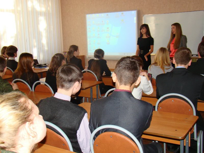 Говорят, что лучше один раз увидеть, чем сто раз услышать, но мы решили и показать, и рассказать. Видеоролики о нашем факультете так увлекли ребят, что уже через пару мгновений они весело смеялись и одобрительно кивали головами. После просмотра мы рассказали ученикам о жизни историко-филологического факультета: о студсовете, пресс-центре, спортивной жизни, агитпоходах. И ребята, ещё недавно такие серьёзные и настороженные, слушали затаив дыхание. Слышались одобрительные восклицания.
