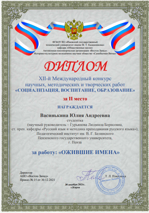 Её конкурсная работа была посвящена сохранению исторической памяти в Пензенском регионе и называлась «Ожившие имена». Научный руководитель – старший преподаватель кафедры «Русский язык и методика преподавания русского языка» Людмила Борисовна Гурьянова.