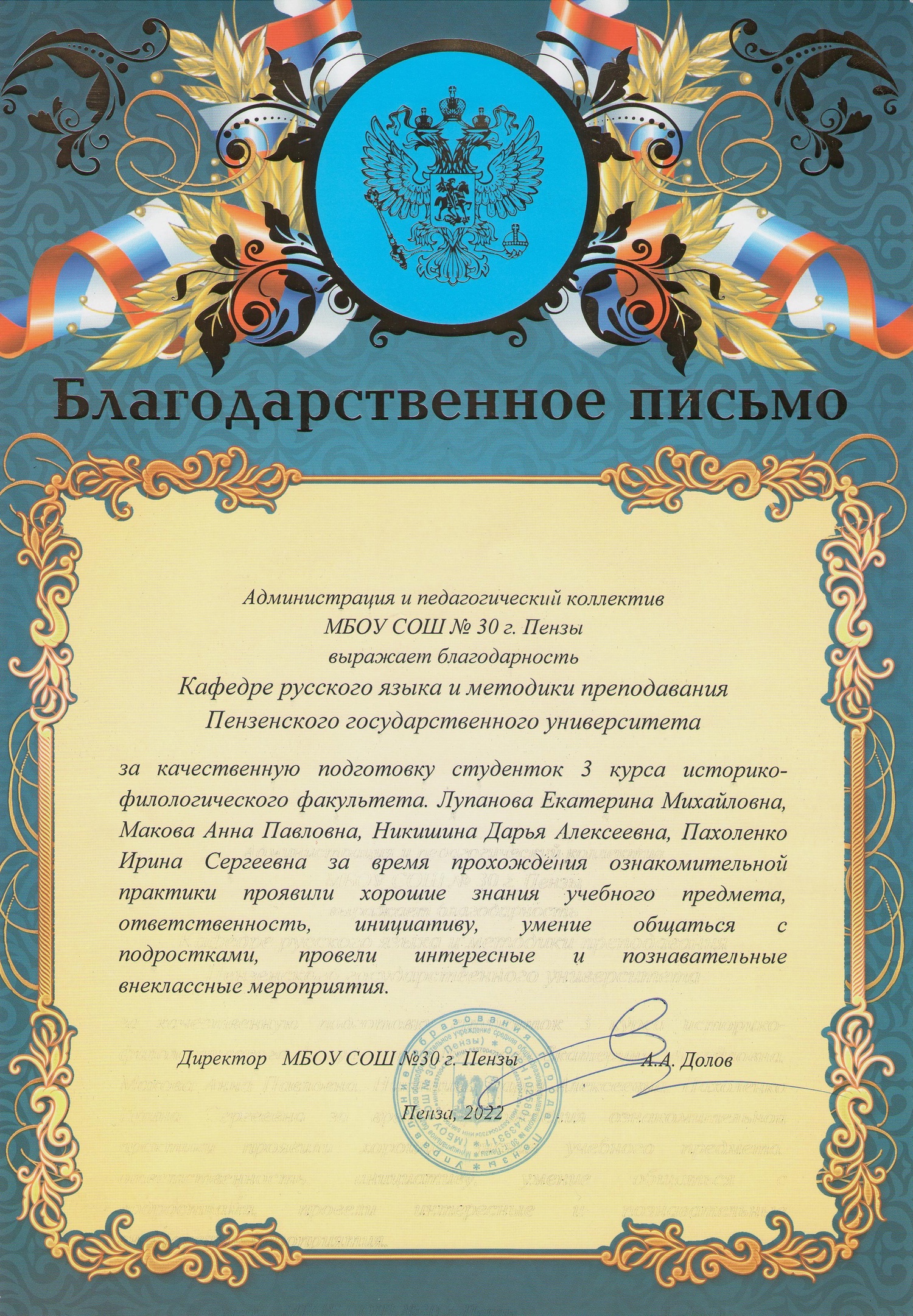 Администрация и педагогический коллектив МБОУ СОШ № 30 г. Пензы выразили благодарность кафедре
