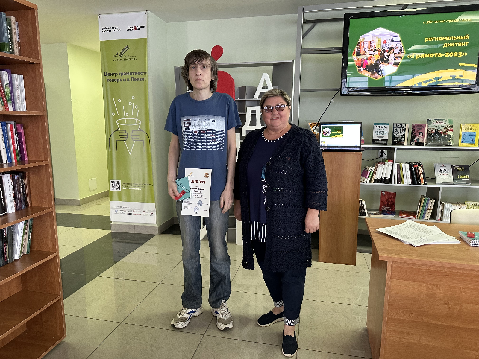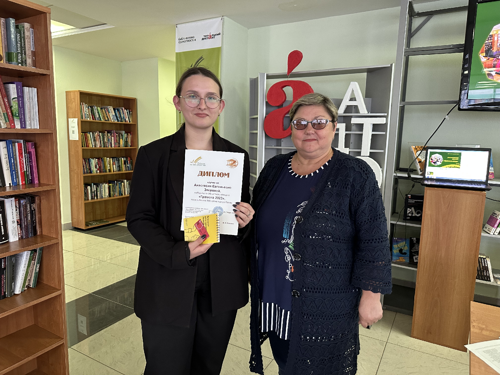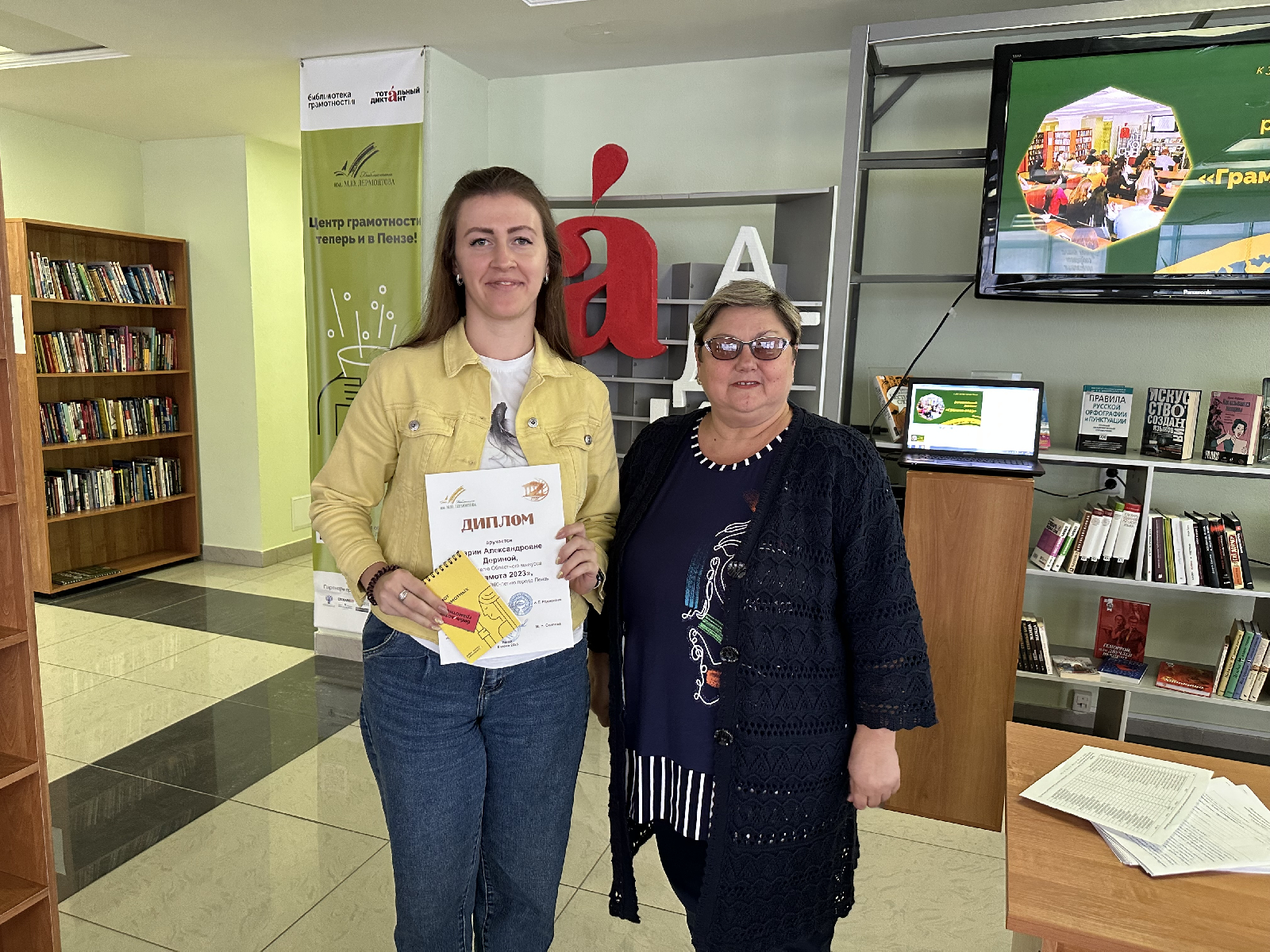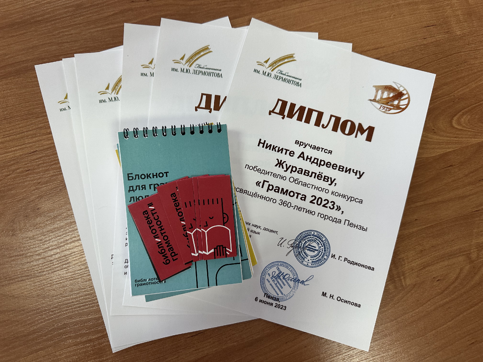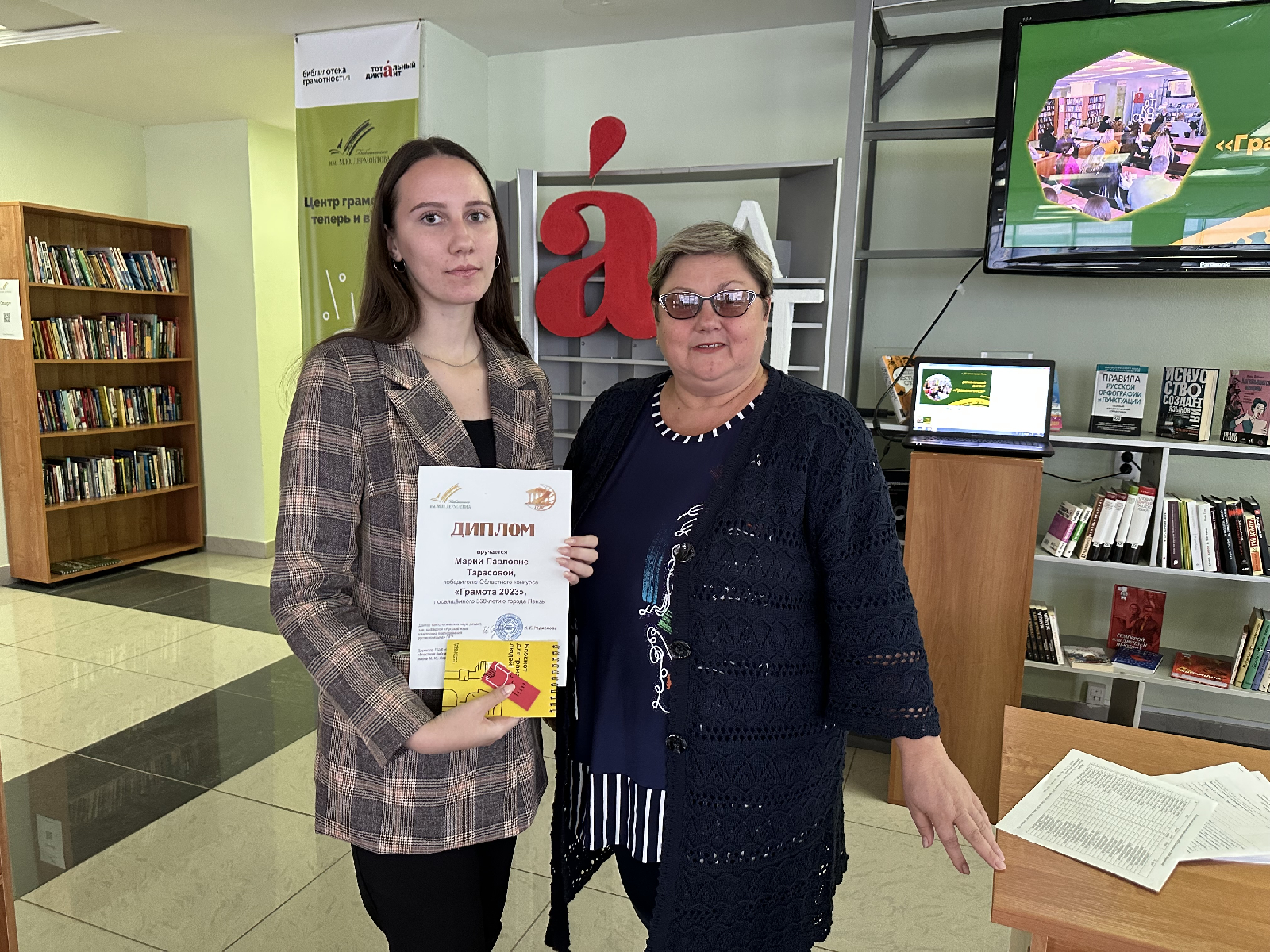 22 июня 2023 г. в Центре грамотности библиотеки имени М. Ю. Лермонтова прошло награждение победителей областного конкурса «Грамота-2023». На «5» диктант написали 5 человек: Н. А. Журавлев, А. Б. Казарчук, М. П. Тарасова, А. Е. Зверева, М. А. Дерина.; на «4» – 12 чел.; на «3» – 9 чел.; на «2» – 2 чел.