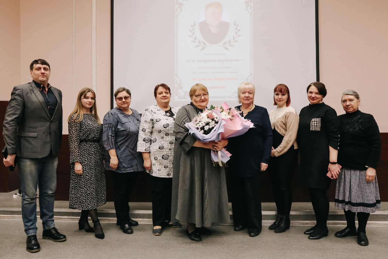 Получилось так, что мероприятие стало завершающим делом нашей кафедры в уходящем году, который был объявлен Годом педагога и наставника. И это показалось очень символичным, потому что Людмила Борисовна являет собой пример поистине настоящего педагога и наставника; своим педагогическим трудом, преподавательской деятельностью, да и вообще отношением к жизни и к людям она показывает и доказывает, что главными ценностями человека являются семья, преданность делу, которое выбрал, и благодарность тем, кто дал тебе путёвку в жизнь.