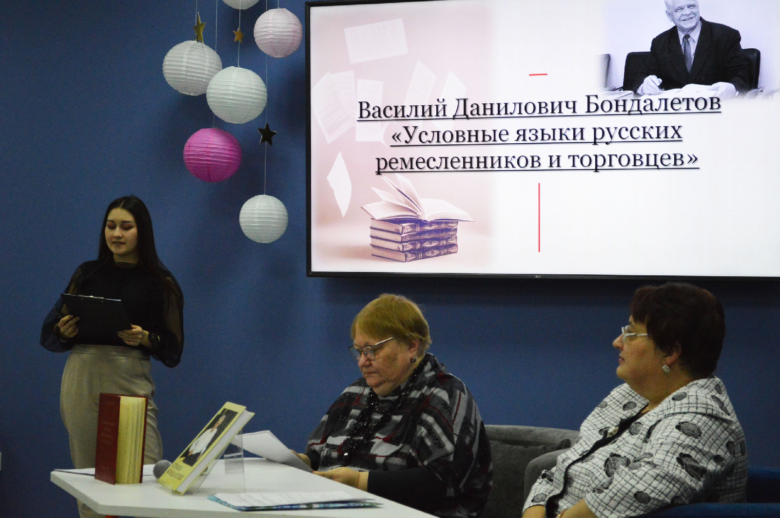 Важно, что в качестве докладчиков на мероприятии выступили и студенты-филологи. Так, Анна Асташкина, студентка группы 20ИПД1, представила результаты исследования В. Д. Бондалетовым частотности употребления мужских и женских имён в ХVIII–ХХ веках. А Лилия Таирова, студентка группы 20ИПД2, рассказала о тайных языках, изучению которых учёный посвятил несколько лет.