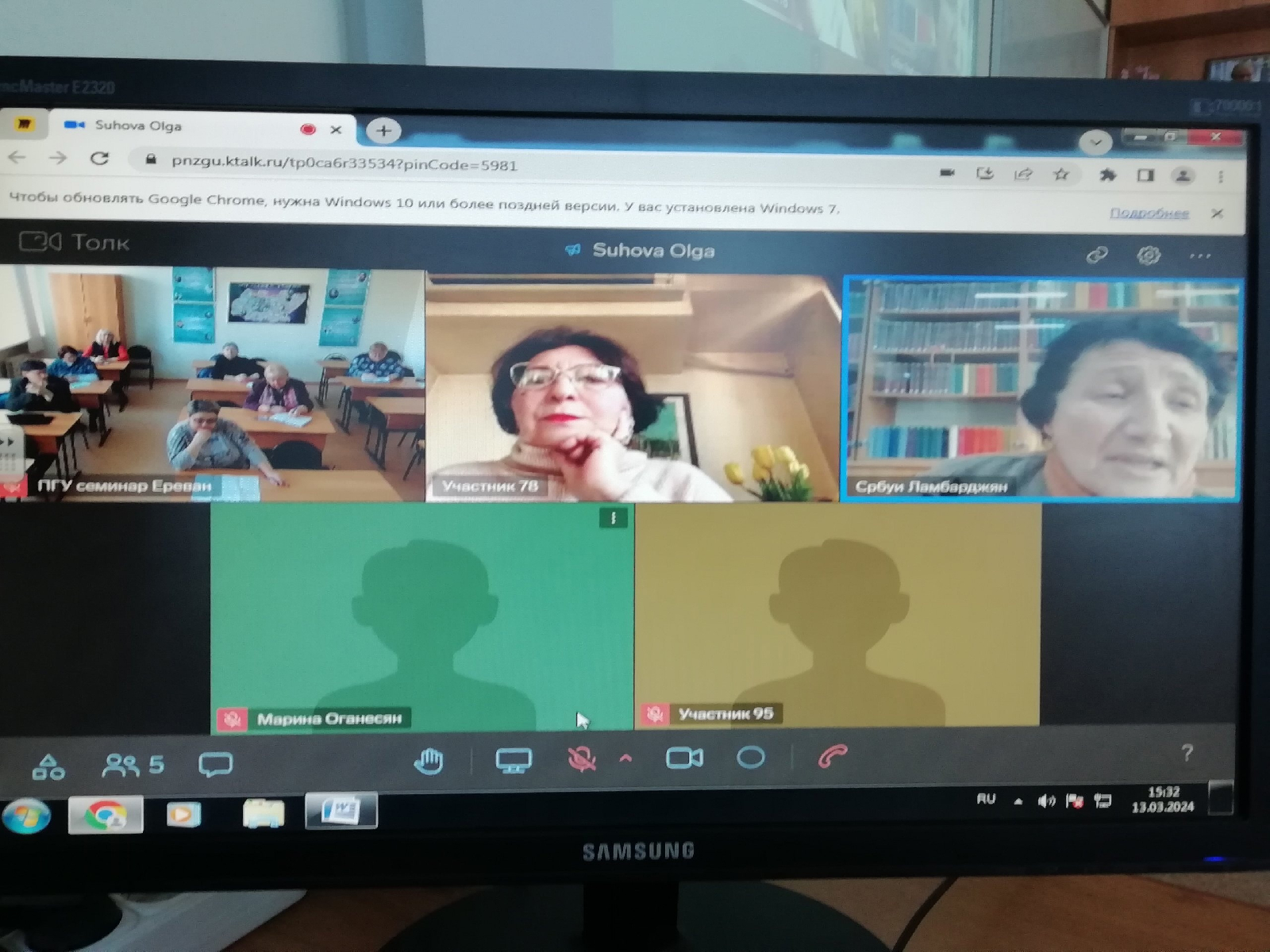 13 марта 2024 года состоялся международный научно-методический онлайн-семинар «Актуальные проблемы русистики», объединивший преподавателей Пензенского государственного университета (Россия) и Ереванского государственного университета (Армения).