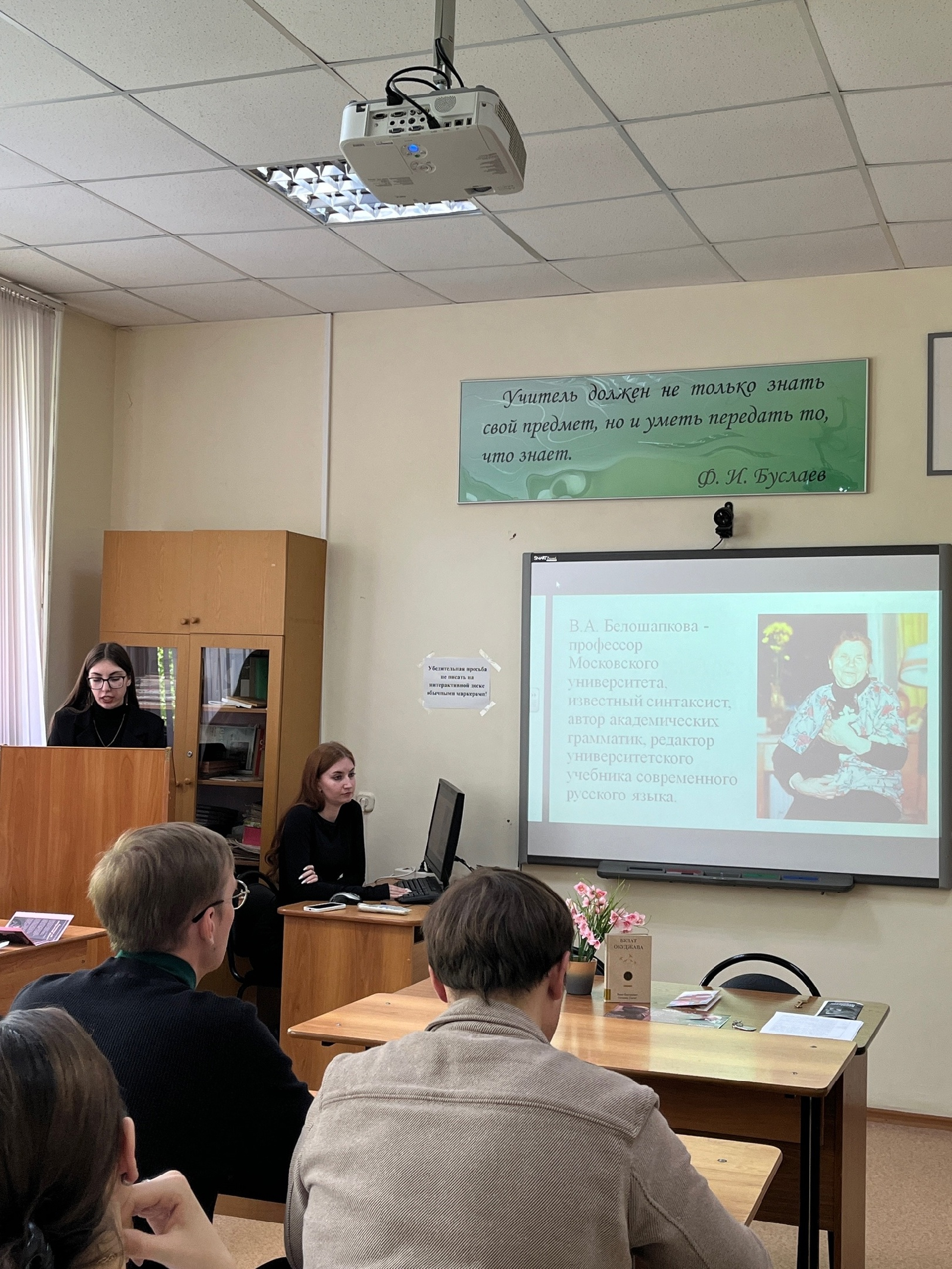 Студентка группы 20ИПД1 Дарья Ефимова рассказала участникам научного мероприятия о жизни и деятельности известного синтаксиста, доктора филологических наук, профессора Веры Арсеньевны Белошапковой.