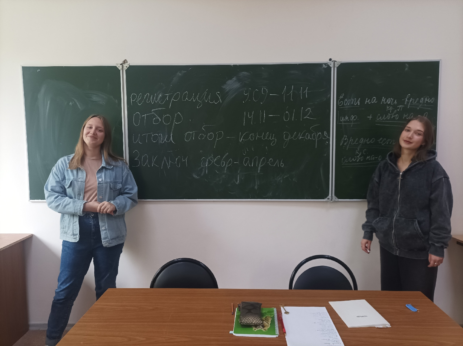 Студентки четвёртого курса Алина Бибикова и Мария Купчинина поделились с первокурсниками опытом участия во Всероссийской студенческой олимпиаде «Я – профессионал», рассказали о сроках проведения олимпиады, о том, как правильно на неё зарегистрироваться, на что обратить внимание при выполнении заданий.