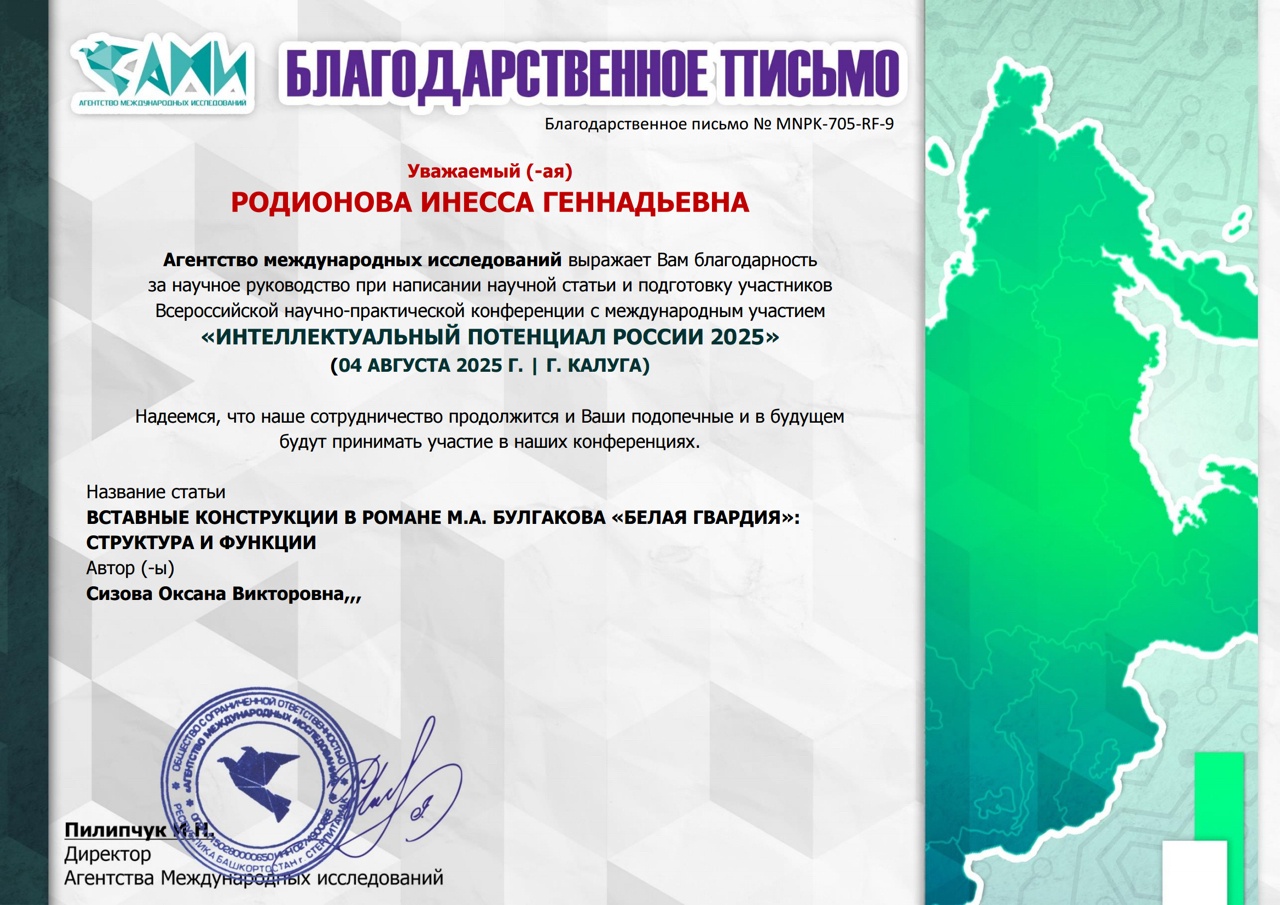 Заведующий кафедрой «Русский язык и методика преподавания русского языка» Инесса Геннадьевна Родионова получила благодарственное письмо от Агентства международных исследований за научное руководство при написании научной статьи и подготовку участника Всероссийской научно-практической конференции с международным участием.