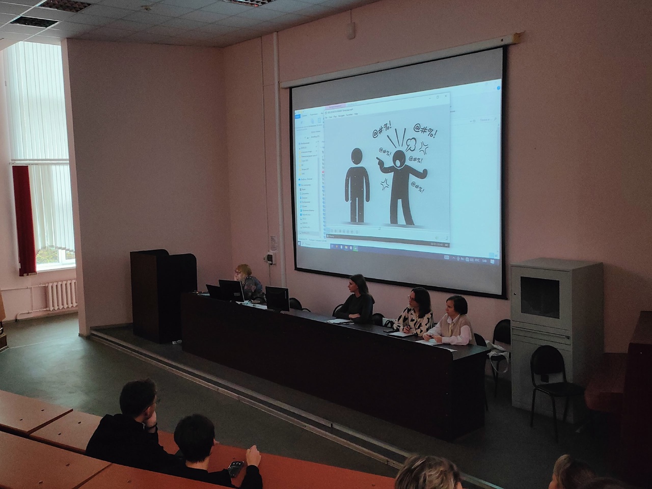 Студенты 1 курса разных направлений подготовки встретились со студентами группы 23ИПД1 , которые реализуют ректорский грант «Ставим условие: забудь сквернословие!» В. Чертиной, К. Власовой и Д. Фалаеевой и их научным руководителем Л. Б. Гурьяновой.