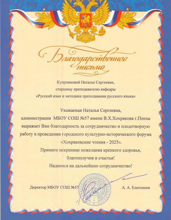 Во время городского культурно-исторического форума «Хохряковские чтения – 2025» для обучающихся 4-11 классов общеобразовательных организаций г. Пензы, проходившего на базе МБОУ СОШ № 57, старший преподаватель кафедры «Русский язык и методика преподавания русского языка» Н. С. Куприянова выступила в качестве эксперта – председателя жюри в секции «Литературный калейдоскоп Сурского края».