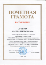 18.12.2014 17:03 Доцент М. Г. Луннова награждена Почётной грамотой Управления образования города Пензы