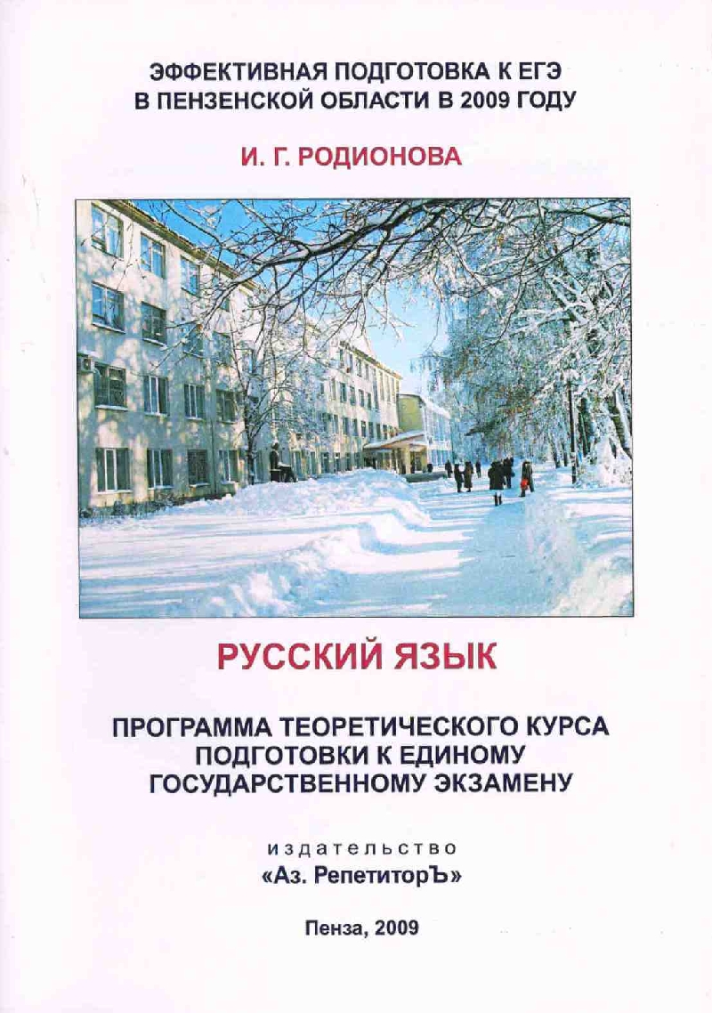 Родионова, И. Г. Русский язык: Программа теоретического курса подготовки к Единому государственному экзамену / Под редакцией Г. И. Канакиной / Серия "Эффективная подготовка к ЕГЭ в Пензенской области". - Пенза: "Аз. Репетиторъ"; ГУМНИЦ, 2009. - 17 с.