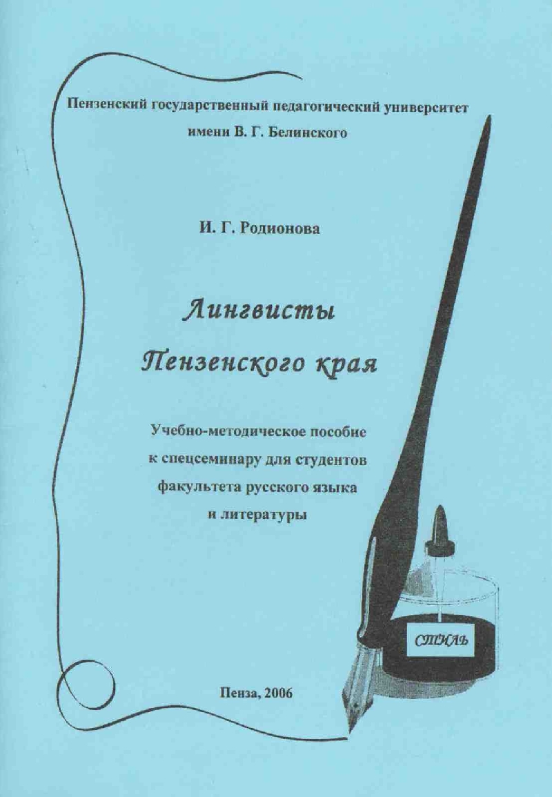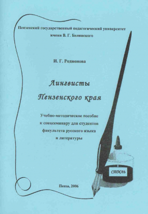 Родионова И. Г. Лингвисты Пензенского края [Текст] / И. Г. Родионова: учебно-методическое пособие к спецсеминару для студентов факультета русского языка и литературы / Под ред. Г. И. Канакиной. - Пенза: ПГПУ им. В. Г. Белинского, 2006. - 40 с.